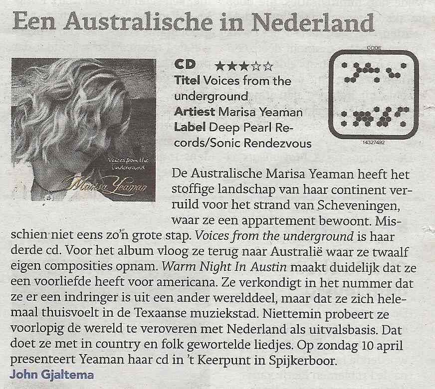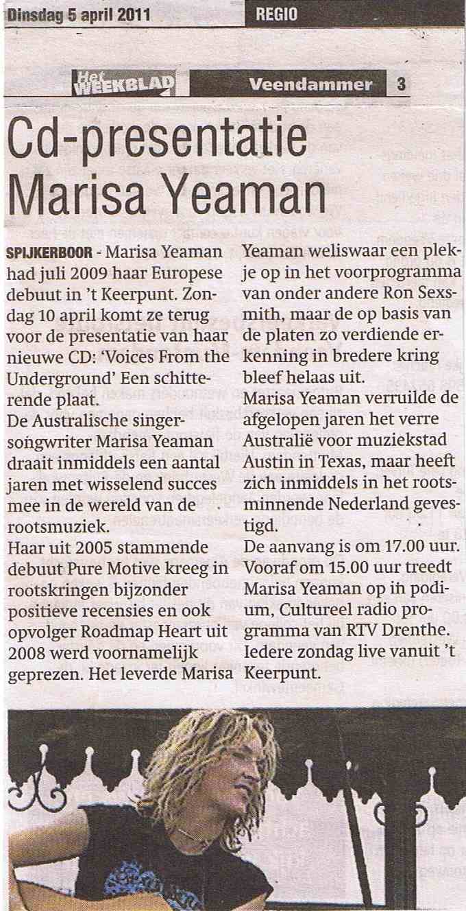 Marisa Yeaman: CD Lauch Party For 'Voices From the Underground' (European Relaese New CD). Zondag 10 april in PODIUM, RTV Drenthes Cultuurprogramma, iedere zondag live radio vanuit 't Keerpunt. Aanvang15:00. Publiek welkom, entree gratis. Vanaf 17:00 concert met Marisa Yeaman in de gelagkamer. Vrij entree, vrije gift.
