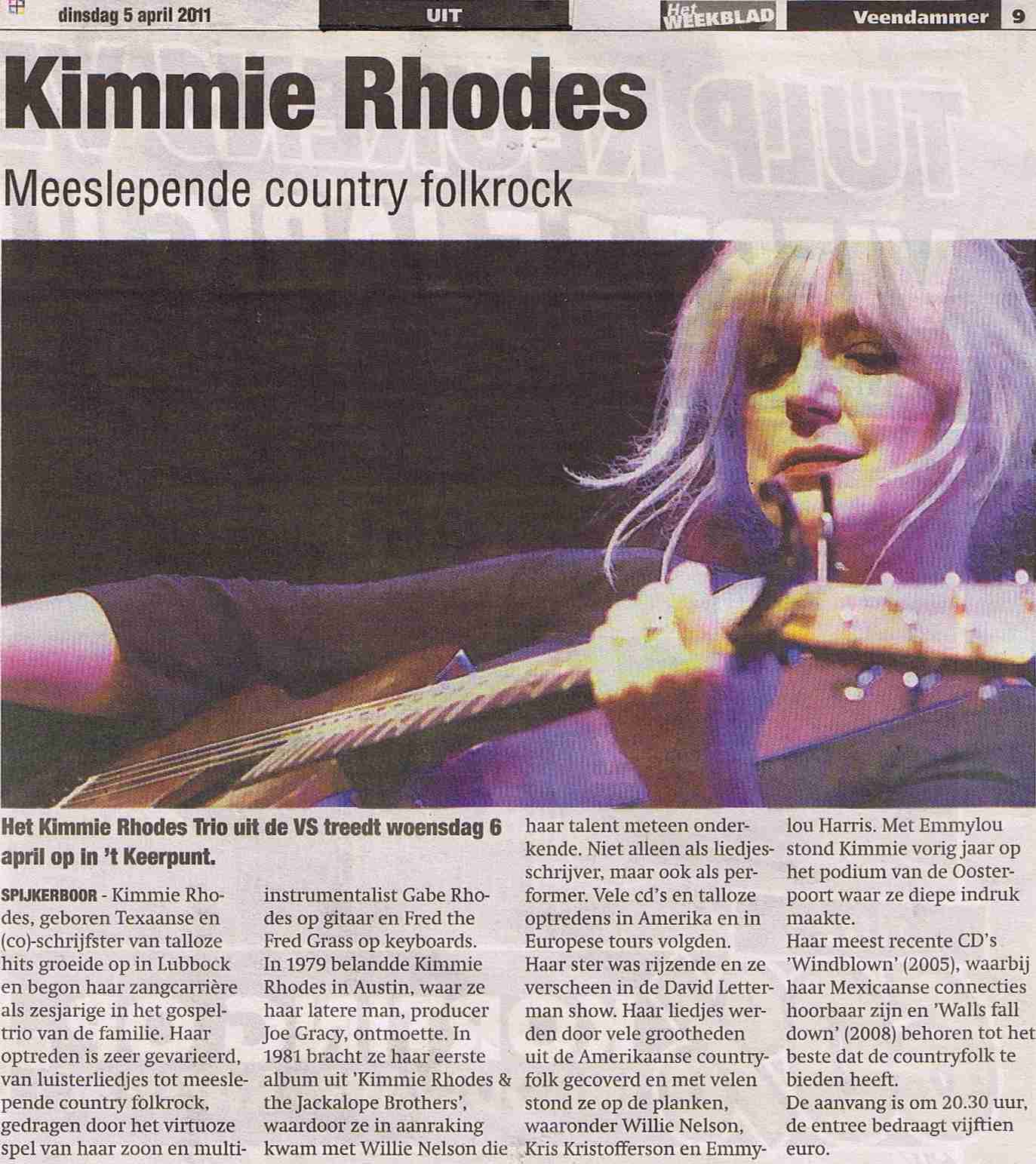 Kimmie Rhodes was in ’t Keerpunt en haar fans waren al op tijd aanwezig. Met de ondersteuning van haar zoon Gabe Rhodes op gitaar en Fred the Fred op toetsen bracht ze een prachtig concert. Het publiek was afwisselend muisstil en uitbundig, wat hem vooral zat in Kimmie’s gevarieerde muziekkeuze, en in haar performance. De Texaanse weet tot tranen toe te bewegen om vervolgens met country folkrock te vervolgen. Het aanwezige publiek tot uit het midden van het land, bleef na de signeersessie nog lang hangen. Wat Kimmie deed besluiten de gitaar weer op te pakken en unplugged nog een paar liedjes te doen, midden in de kring van fans en genieters die zachtjes meezongen. Het was een fantastisch moment en een mooie afsluiting van een gaaf concert met een wereldmuzikant en mooi mens! Jammer dat zoiets bijzonders zo snel voorbij gaat, zoals Kimmie opmerkte: ‘Jammer dat we hier maar zo kort zijn’! Om 13:00 gaan ze weer ‘On The Road’ richting Hamburg naar het volgende optreden.