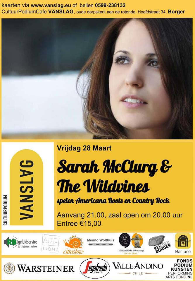 De Canadese countryzangeres Sarah McClurg, winnares Country Artiest van het jaar bij de LA Music Indie Awards 2011, is vrijdag 28 maart te gast bij VANSLAG Borger. Met haar mee komt de band ‘The Wild Vines’, afkomstig uit Ottawa. Deze band voelt zich vooral thuis in landcountry, pop en rock; Maar ook voor pure Americana gaan ze niet aan de kant. Typisch weer zo’n Noord Amerikaans gezelschap die het publiek alle hoeken van hun muzikale kunnen wil laten ontdekken.
