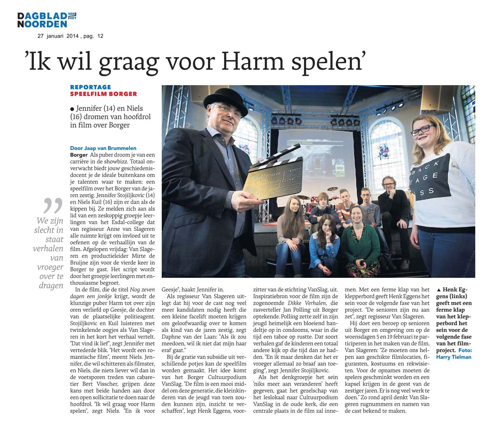 Op woensdag 5 en 19 februari zijn er bij Cultuurpodium VanSlag (in de voormalige dorpskerk in Borger) twee groepsbijeenkomsten. Dan gaan we samen met u uitzoeken hoe we het scenario kunnen verfilmen en wat daar allemaal voor nodig is. Bent u daarna enthousiast om verder te helpen om de film te gaan opnemen, dan kunt u zich na afloop opgeven voor de crew of de cast van de film.