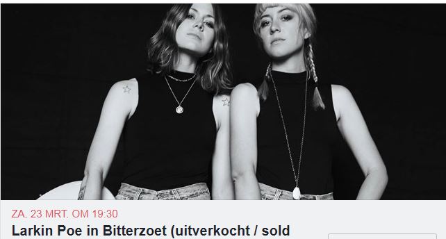 Twee optredens in Nederland; Oude Bildzijl Fr. (22 mrt) en Bitterzoet Amsterdam (23 mrt). Beide zijn uitverkocht. Je kunt het nog proberen via TicketSwap, je weet het maar nooit.