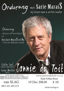 Jannie du Toit, topambassadeur van de Suid Afrikaanse Folk stond in VANSLAG en met hem twee topmuzikanten: Susan Mouton, hoofd-celliste van het Johannesburgse Filharmoniese Orkes en Clinton Zerf op piano. Zij vulden de oude Willibrordkerk op hele mooie wijze met het hoofdprogramma 'Onderweg' wat speciaal was afgestemd op het Nederlandstalige publiek. Na de pauze volgde een overzicht van Afrikaanstalige muziek uit de afgelopen eeuw, dat met een knipoog de titel 'Van Sarie Marais tot nu' meekreeg.