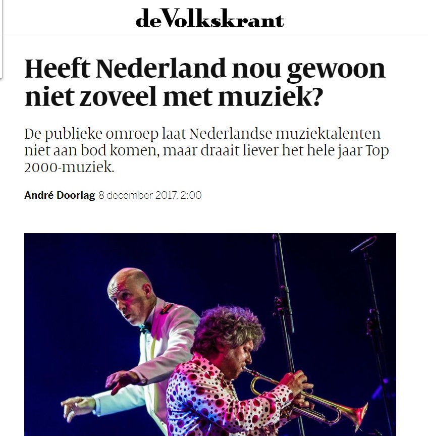 Hebben wij in Nederland niet zoveel met muziek zoals in België of Scandinavië. En zijn we al tevreden met wat Top 2000-plaatjes? 'Misschien heeft het landschap onze weinig muzikale volksaard gevormd. We leven in een vlak/plat land. Onze liefde en gevoel voor muziek is ook vlak en voorspelbaar'. Je kunt je afvragen, waarom er niet meer protest tegen is. Datzelfde geldt voor het kletsen tijdens een concert... LINK de Volkskrant https://www.cultuur-ondernemen.nl/interview-met-directeur-toine-tax-van-poppodium-doornroosje? Lees verder voor een discussie op Facebook 17 feb jl.