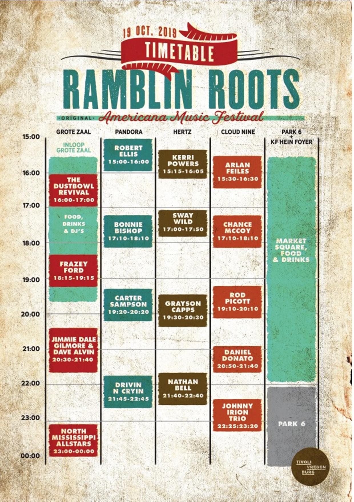TivoliVredenburg heeft het Ramblin Roots blokkenschema op veler verzoek aangepast. Waarvoor hulde! Het festival biedt nu meer ruimte om zoveel mogelijk te beluisteren. North Mississippi Allstars is zelfs een uur doorgeschoven en eindigt nu om middernacht. De omcirkelde artiesten willen we zeker ontmoeten, zij stonden eerder op het Roots on the Road podium: The Dustbowl Revival (3x), Kerri Powers, Grayson Capps, Rod Picott (3x) en Johnny Irion Trio (met ega Sarah Lee Guthrie) (2x).