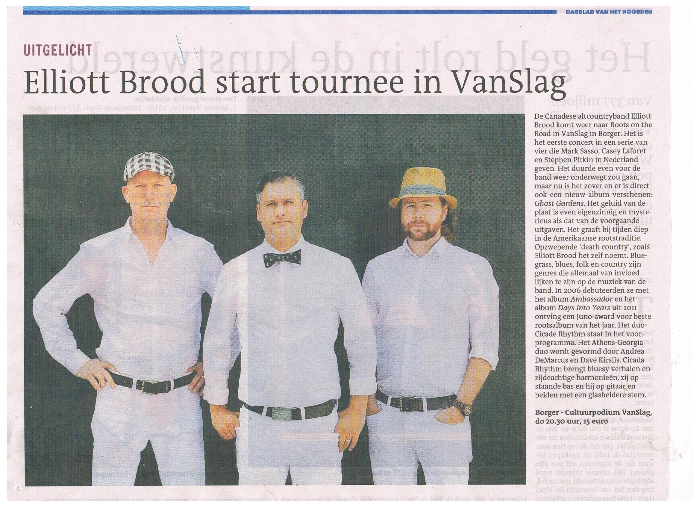 Elliott Brood in de krant van vandaag. Alternatieve dark country uit Toronto, Canada, voor de vierde maal naar Roots on the Road in VanSlag; En we krijgen er nooit genoeg van! Met het fijnzinnige Cicada Rhythm uit Amerika als voorprogramma.