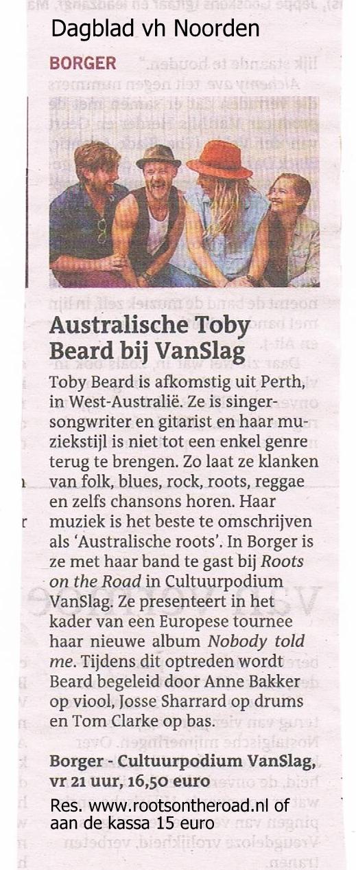 BORGER – Een concert van Toby was altijd en is nog steeds een feestje. Op het feestje is echter steeds meer ruimte gekomen in de loop der jaren voor de schaduwkanten van het leven en voor bezinning. Vast adres op haar reizen is de kerk van Borger voor een bezoek aan Van Slag / Roots on the Road waar de Australische al weer voor de vijfde keer stond. Alleen dat al is reden voor een feest, maar Toby begon alleen aan een ingetogen eerste set met slechts haar gitaar en het nummer 'Stay' voor ze in het tweede nummer pas haar band op het podium riep voor 'Smile'. “Ik ben er voor in de stemming”, vertelde de zangeres. In de eerste set veel ouder werk van vooral haar album 'Nobody Told Me' als 'Last Night' wel vrolijk en stevig ingezet, maar ook veel erg mooie en gevoelige nummers als 'Three Days' en 'Temple'.