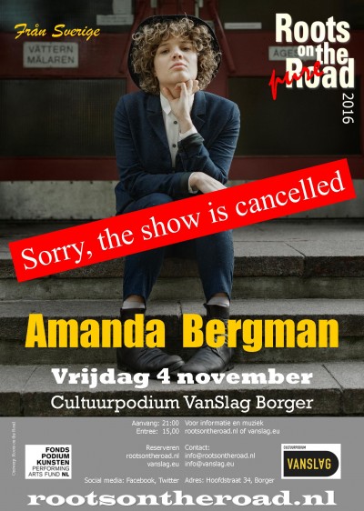 Concert Amanda Bergman op vrijdag 4 november in VanSlag is om persoonlijke reden van haar geannuleerd. We zijn helemaal confuus, jammer, jammer.