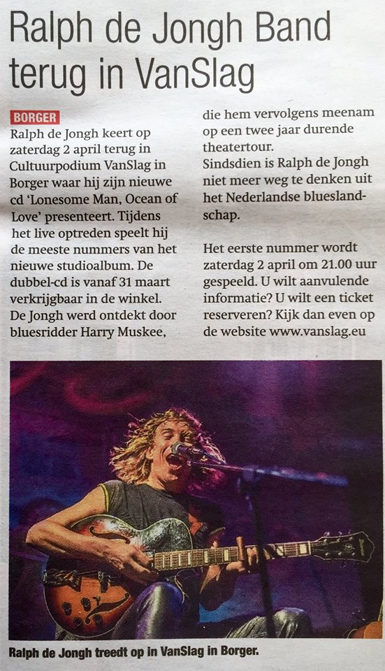 Ralph de Jongh en zijn companen gisteravond (2 april), geweldig in VanSlag. Wat minder bluesy maar steeds meer eigen. Mooie samenwerking met het publiek. En Arend Bouwmeester, meesterlijk op de saxofoon, vertrouwd ons toe dat hij ons rekend tot een handvol podia in Nederland waar de muziek echt beleefd wordt. Trots op VanSlag, trots op Ralph cs. en andere muzikanten, trots op Klaas Guchelaar die alles weer vastlegde voor hen die het misten en trots op onszelf omdat we gewoon van goede pure muziek houden en bovenal van mensen!!!!