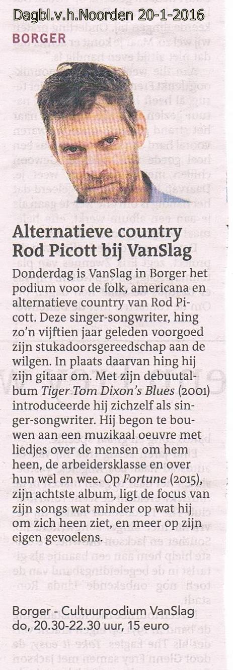 BORGER – Af en toe kijkt en zingt hij met zijn Oom Jan blik het publiek in vanaf het podium bij Van Slag in Borger. Vervaarlijk, verbolgen en klaar om toe te happen. Uiterlijk vertoon, want Rod Picott toont zich in zijn liedjes vaak van zijn gevoelige kant en snijdt in zijn werk met veel mededogen thema's als verlating, uitzichtloosheid, hard werken en familie relaties aan, zoals met Uncle John en zijn vader en grootvader.