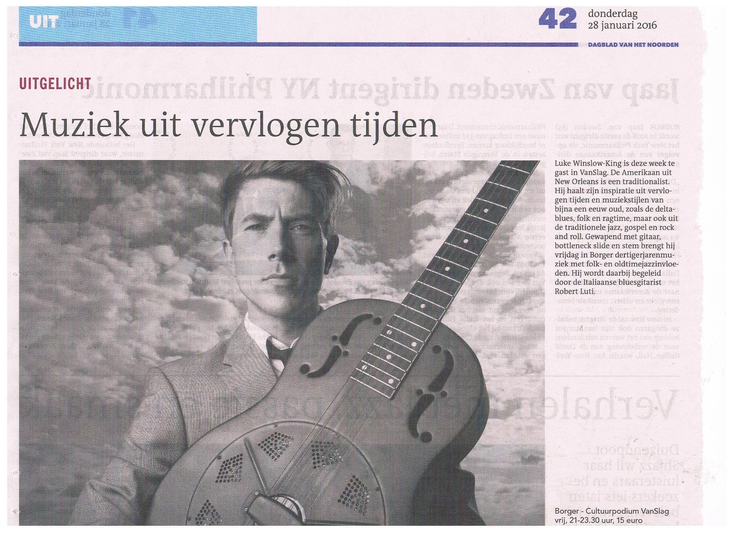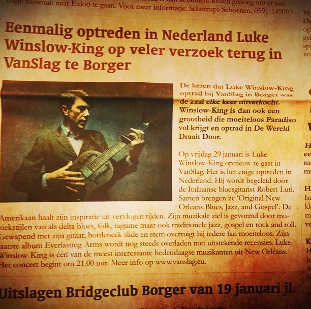 Luke Winslow King vandaag paginabreed in Dagblad van het Noorden. Op dit moment toert hij in Engeland. Vrijdag steekt Luke over naar Nederland, naar Borger. Bluesgitarist Roberto Luti komt dan speciaal over uit Italië. Samen willen ze er vrijdag bij Roots on the Road in VanSlag een geweldige exclusieve NL show van maken. De volgende dag vertrekken ze naar Italië voor het vervolg van de Europese tour. We hebben enorme waardering voor de kwaliteiten van Luke en Roberto en danken hun nu al voor hun enorme inzet. Het belooft een lekker vol huis en dat verdienen ze!