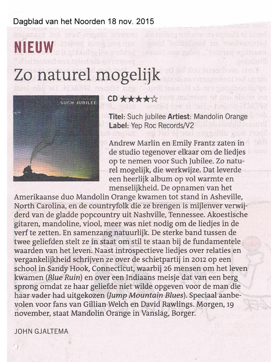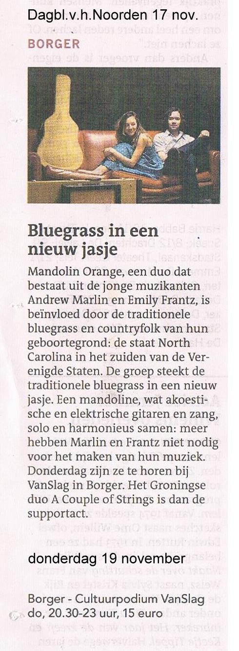 Mandolin Orange vandaag in Dagblad van het Noorden, morgen (19-11) live bij Roots on the Road in VanSlag. In Amerika trekken ze volle zalen, Borger gaat ze nu ook ontdekken!