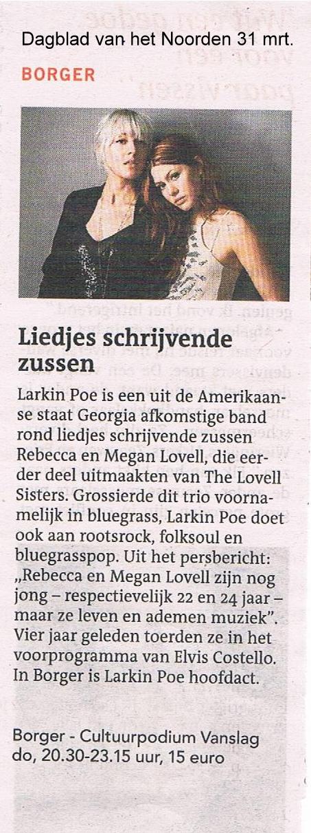 LARKIN POE, is een Amerikaanse Roots Rock Band uit Atlanta, GA. met de zusjes Rebecca Lovell (Jan. 30, 1991) en Megan Lovell (May 5,1989). Naast frontdames Rebecca en Megan Lovell (respectievelijk mandoline/gitaar/viool/leadzang en lapsteel/keyboards/zang) bestaat Larkin Poe uit Robby Handley (bas/keyboards/zang), Marlon Patton (drums) en Brandon Bush (keyboards). Donderdag 2 april ROTR @ VanSlag. Enige optreden in Nederland. Daar moet je bij zijn!!!!